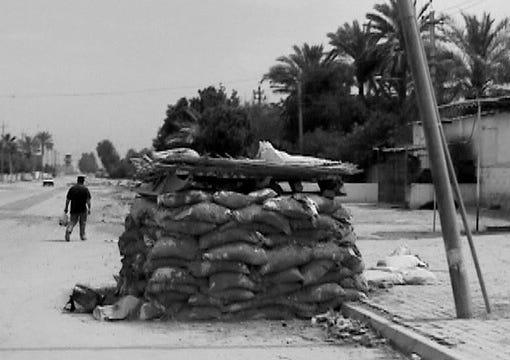We roll on into Baghdad. Our passports are checked at a rudimentary checkpoint, where piles of earth have been bulldozed to improvise a chicane of 'berms'.