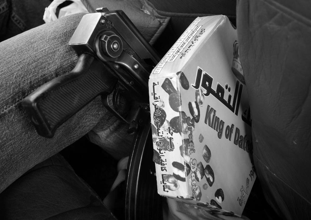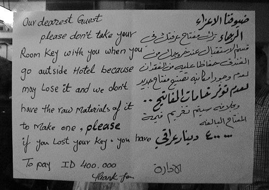 On the highway near Rutbah, an oasis town in the western Iraqi desert with a population of about 30,000, there's a service area with fuel. We are filled up by a bearded middle-aged man holding a wad of Iraqi Dinars with Saddam Hussein's face on them. But he wants dollars.