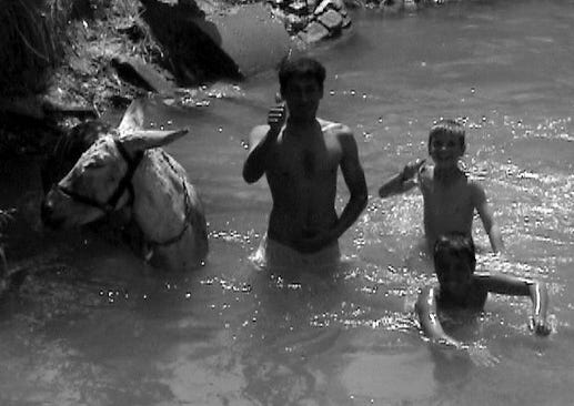 I stopped at a deep pool of water where a man had detached a donkey from a wooden cart loaded with cooking gas cylinders and was leading it into the pool to cool the animal and clean it. He cupped water over it with his hands.