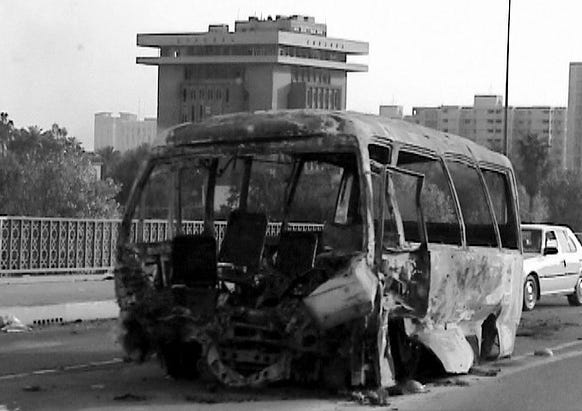 As I was driven around Baghdad, some of the consequences of the hoax were visible on the streets. Mangled, incinerated cars and trucks. Burned-out tanks abandoned in ditches by the road. Government buildings disfigured and gutted by bombs and fire. A ten-storey ministry with several of its upper floors blown apart by a missile. The state radio and TV centre destroyed - leaving only its concrete floors and its steel frame, all blackened by smoke. But alongside it, the 200-metre-high Baghdad Tower (a communications tower with a revolving restaurant and observation deck) was untouched apart from a few smashed windows. It became a vantage point for snipers shooting at Americans.