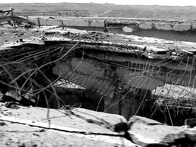 The explosion had made a deep wide crater in the road nearby, leaving scorch marks around it and rough lumps of fractured asphalt. The viaduct carrying the road across a dry river bed had been partly collapsed by the bomb.