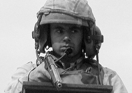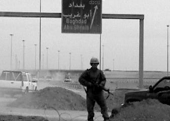 Three American tanks rumble along the other side of the divided highway. They're followed by a Humvee armoured car which lurches towards us and stops abruptly. An American soldier jumps out, urgently shouting a warning: