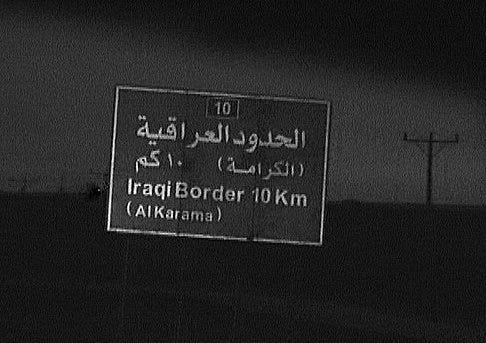 We head for the Iraq border, mostly in the dark. Green road signs count down the distance, fleetingly illuminated by our headlamps.