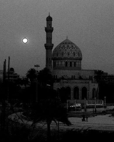 A man with an image of Imam Hussein strapped to his forehead urged me to take his photograph. About twenty others leaned in so that they could be in the picture too. Women under black abayas sat in small groups on the ground and smiled broadly as the light from my flash lit up their faces. And all along the palm-lined promenade and in the broad public spaces around the mosques pilgrims slept on the sandy ground - old men under blankets, young boys curled up together, mothers with babies deeply asleep. There were more smiles when I said, "Good night, baby!" in Arabic.