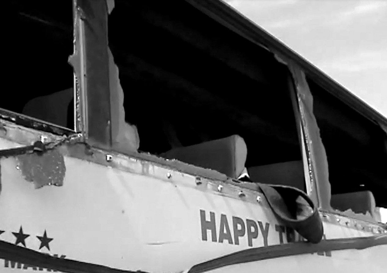 We come across a tour bus, empty and abandoned. The windscreen has been cracked and punctured by shrapnel from an explosion. Most of its windows have been blown in, black curtains are flapping in the gaps. There's a company name on one side of the bus, and its slogan: Happy Travel.