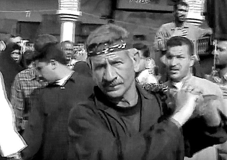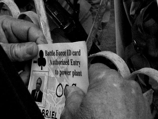 A middle-aged man wearing a helmet and a green Iraqi army uniform pushes to the front of the crowd, holding up a strip of white cloth in each hand. Shouting across the razor wire he offers to surrender to the Americans.