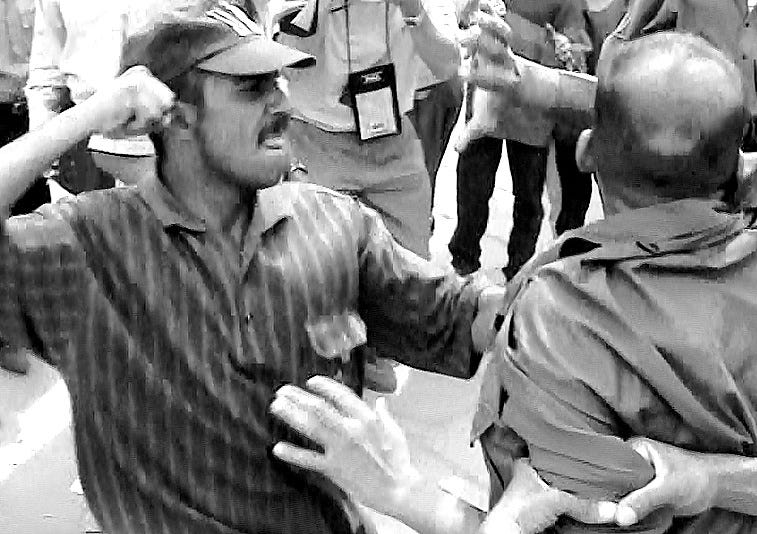 Men in the crowd shout "No! No!" They hit him in the face, on his head, on his back, on his chest. The blows are audible. One man wearing a striped shirt and a baseball cap punches him in the head and knocks him to the ground. The hapless victim's shirt and jacket are torn off. The man in the baseball cap kicks him as he screams "I'm sorry! I'm sorry!” in English.