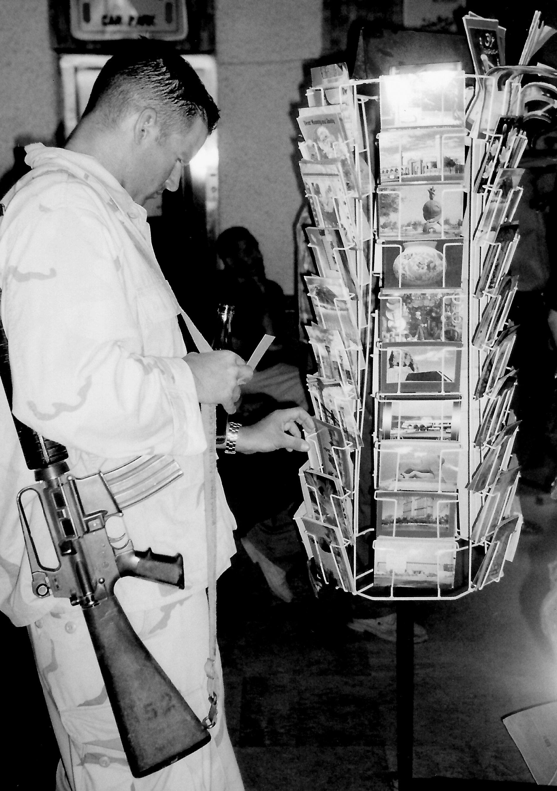 No Iraqi border formalities, just a canvas-roofed US army Humvee and a relaxed American soldier in a soft hat and an automatic rifle slung over his shoulder, in sandy camouflage for desert combat.