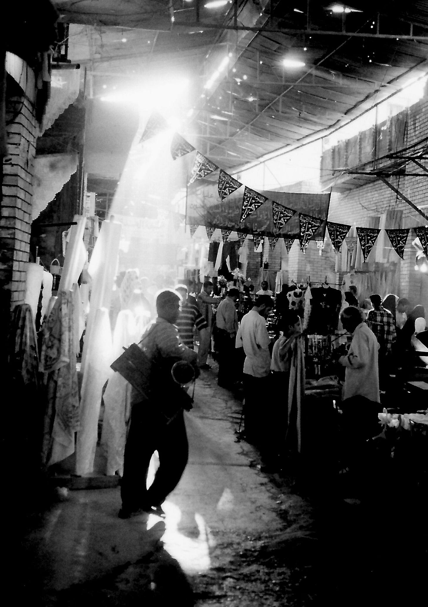 As he walked, lights in the vendors' stalls went out, the market went dark, overhead fans came slowly to a halt, rays of sunshine shafted from holes in the roof, cutting through the dust. The shopkeeper who was talking to me as the power failed - Abu Sahab Saffir, selling cigarettes and flavoured tobacco for nargile water pipes - sighed and said, "Weather very hot, no electricity, no water for drinking, no cooking gas."