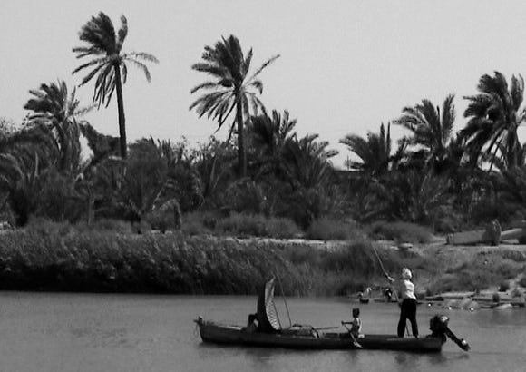 We turned off the tarmac onto a track along the top of one of the soil embankments that Saddam's engineers had built. A warm wind rustled the fronds of a date palm. Marsh frogs croaked loudly from the edge of a stream.